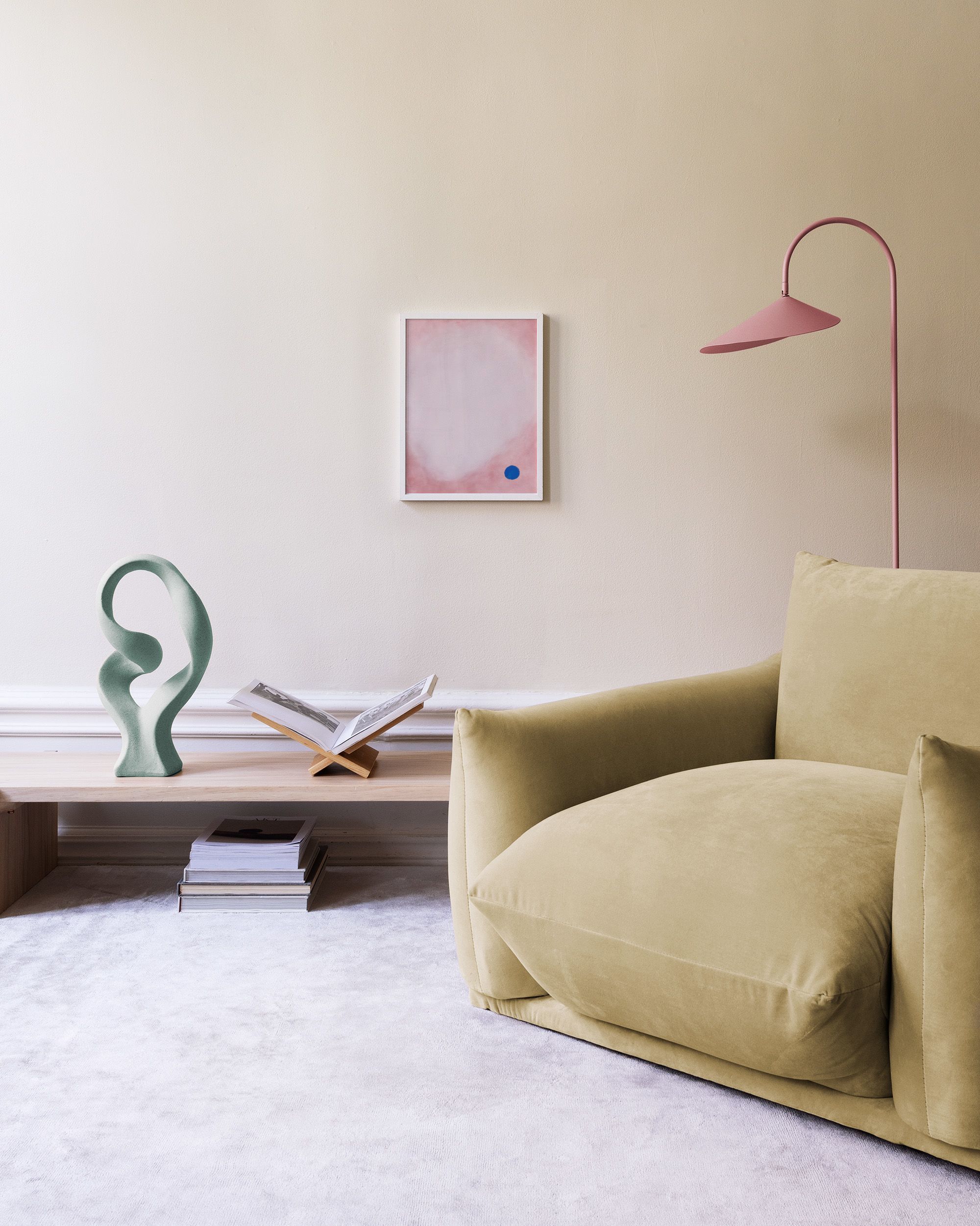 분홍색 배경, 흰 구름, 그리고 파란색 원이 있는 부드러운 추상 포스터입니다. 홈 인테리어에 완벽한 벽면 아트입니다.