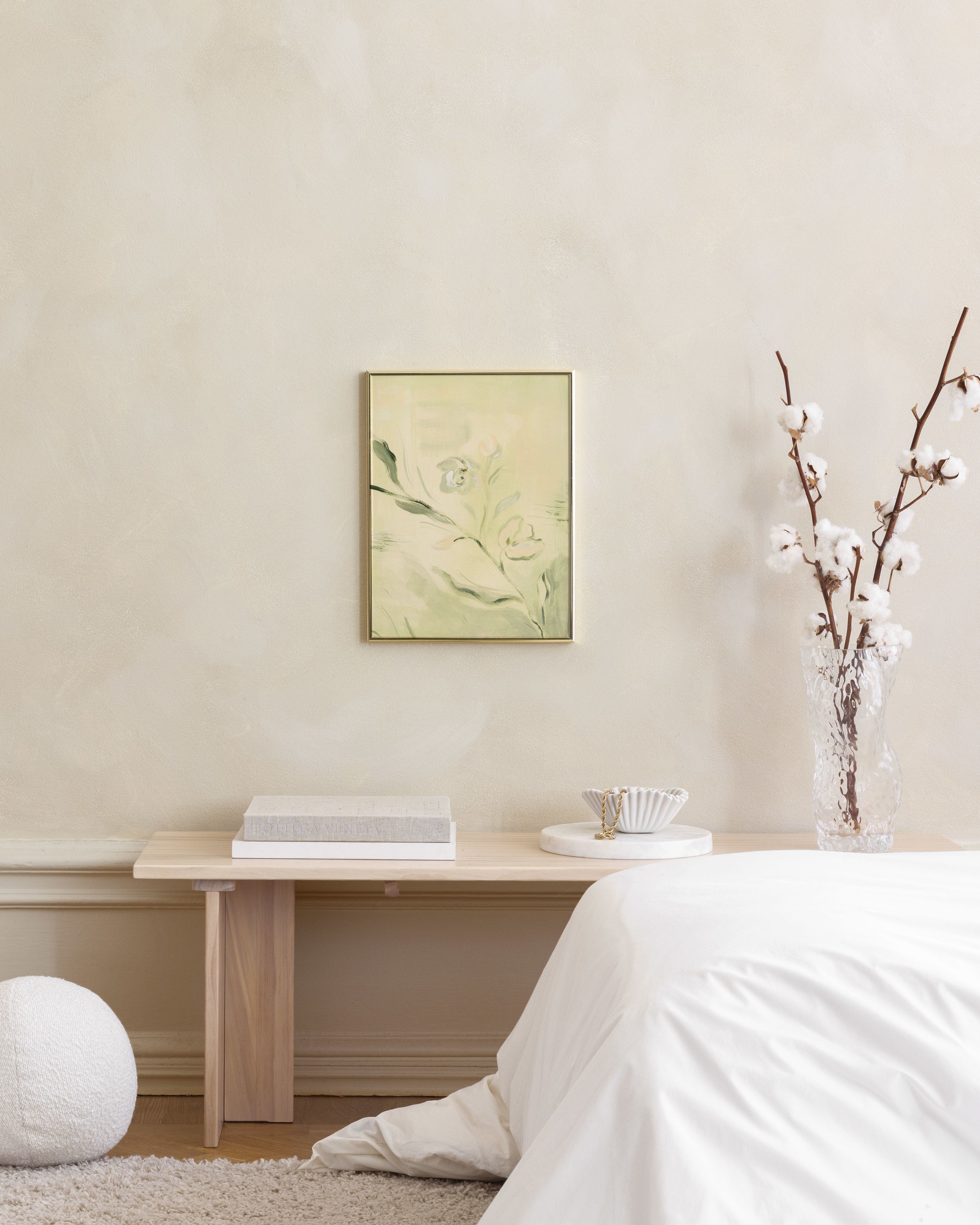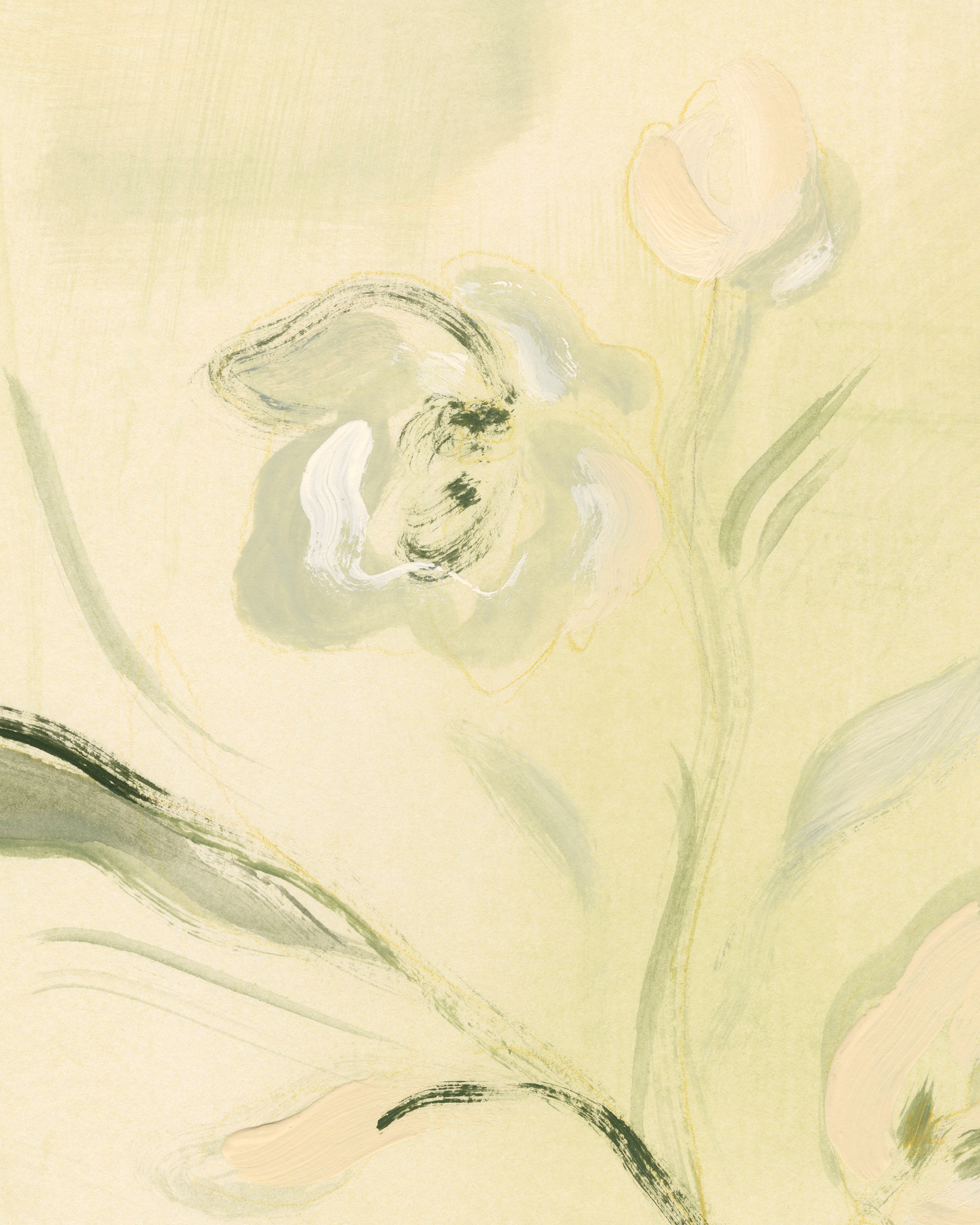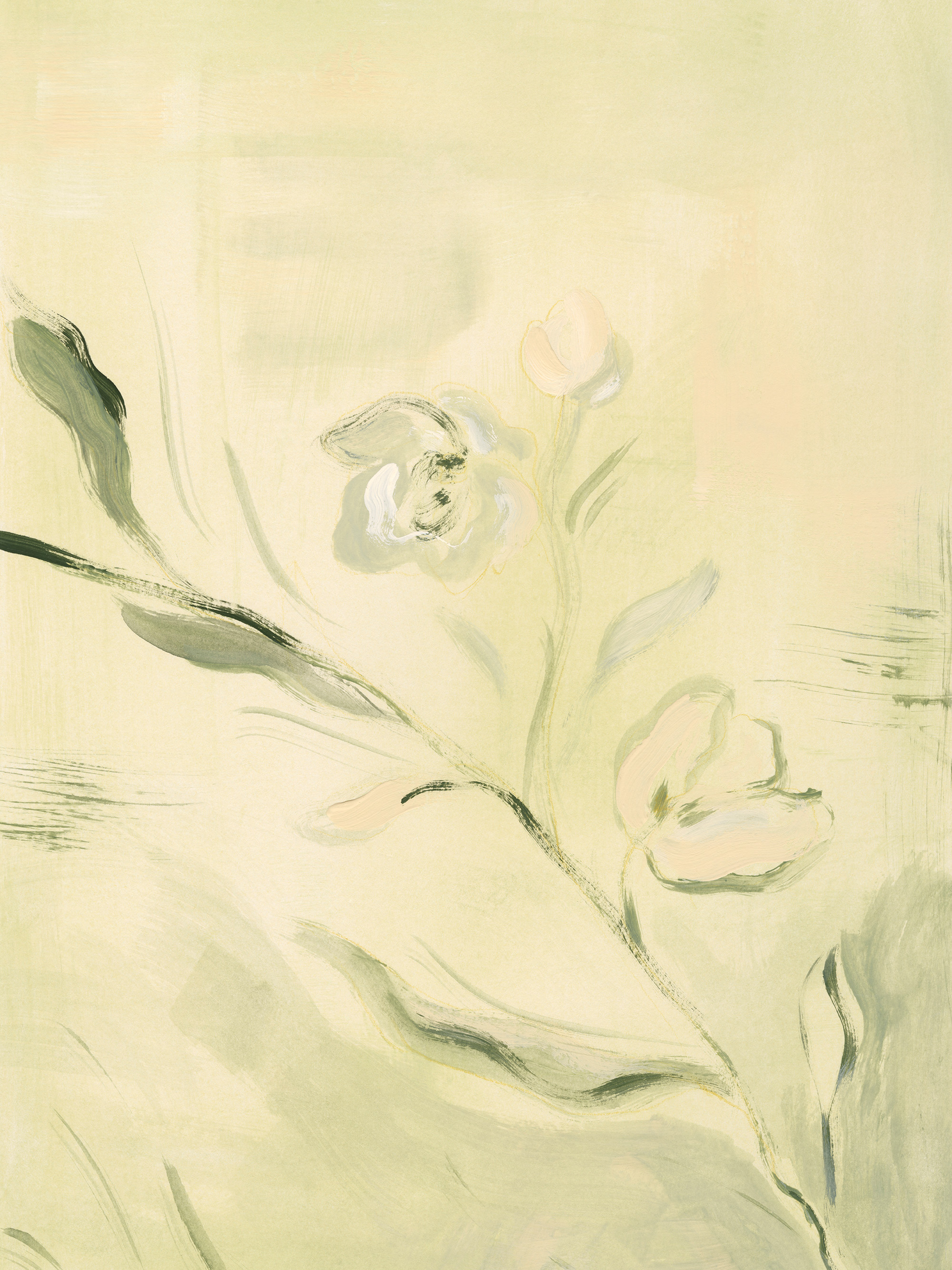 연한 노란색 배경에 녹색, 흰색, 연분홍색의 꽃과 잎이 그려진 부드러운 추상 포스터입니다. 부드럽고 회화적인 붓터치 효과로 몽환적인 느낌을 연출합니다.