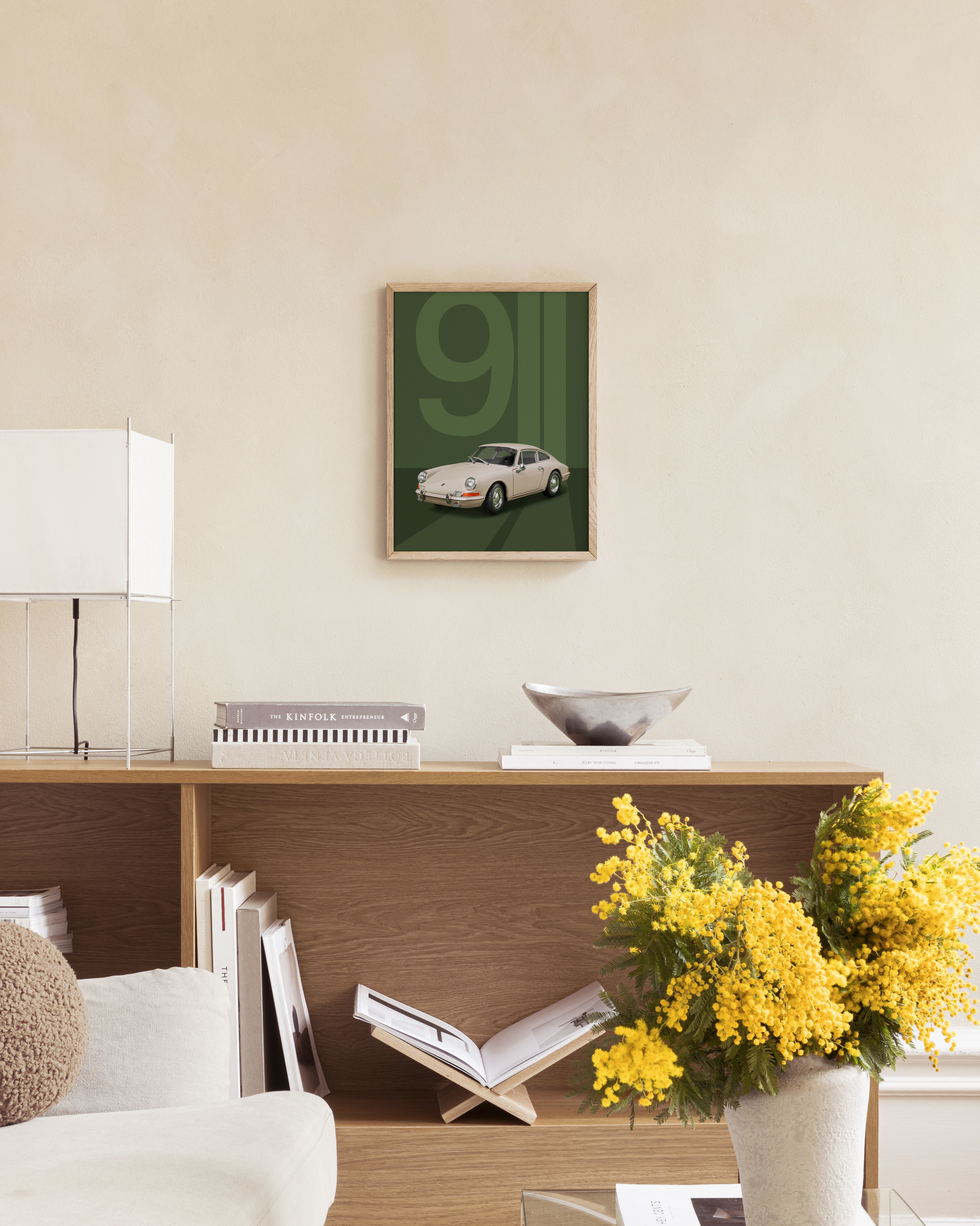 From ₩28,778.40녹색 배경에 둥근 헤드라이트와 크롬 범퍼가 있는 클래식한 베이지색 자동차와 굵은 "911" 숫자가 특징인 포스터입니다. 깔끔한 선과 대조적인 색상의 빈티지 스타일 포스터입니다.