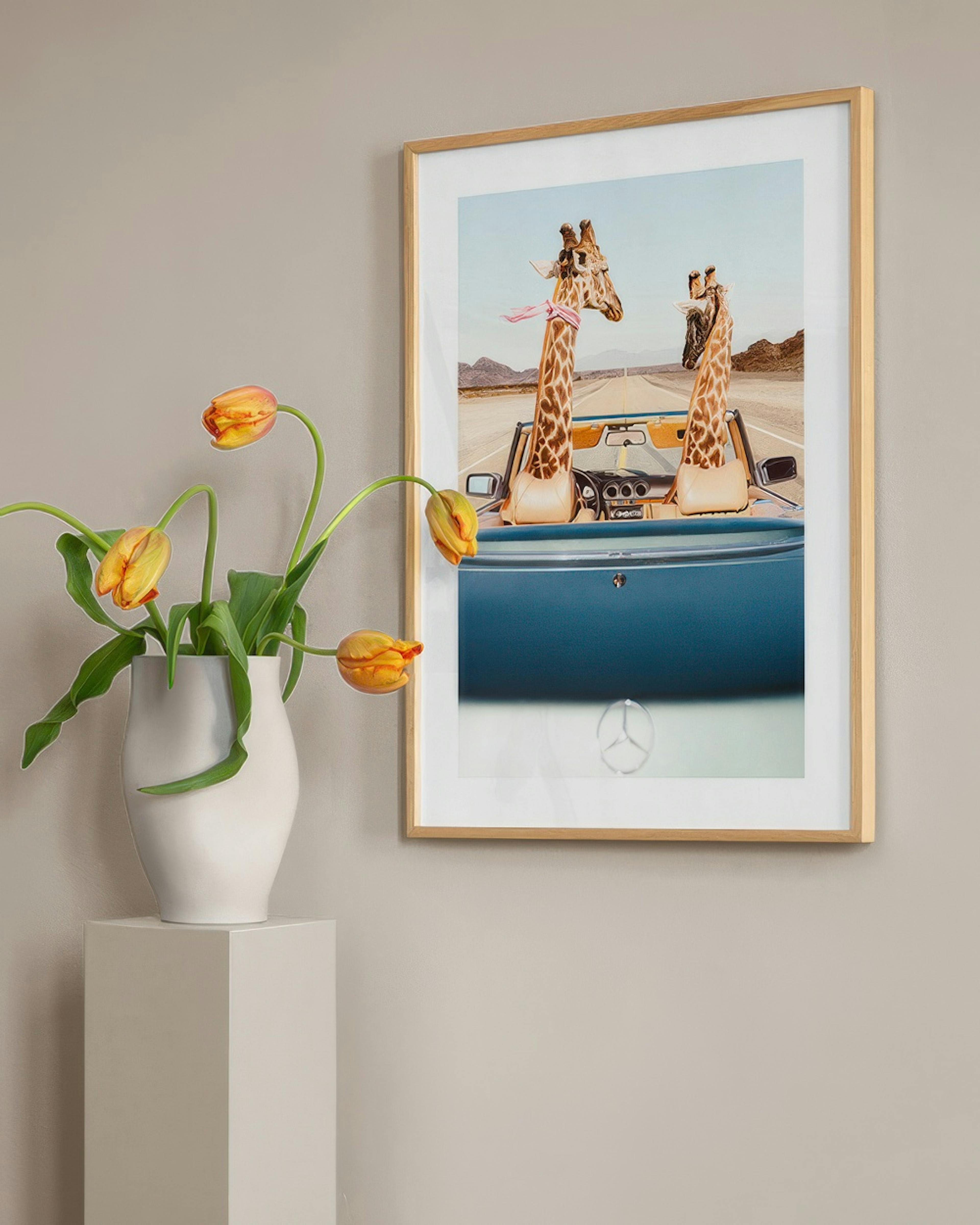 A fun print of two giraffes driving a blue car in the desert. The print goes in hues of blue and beige and will fit perfectly in the bedroom or livingroom.