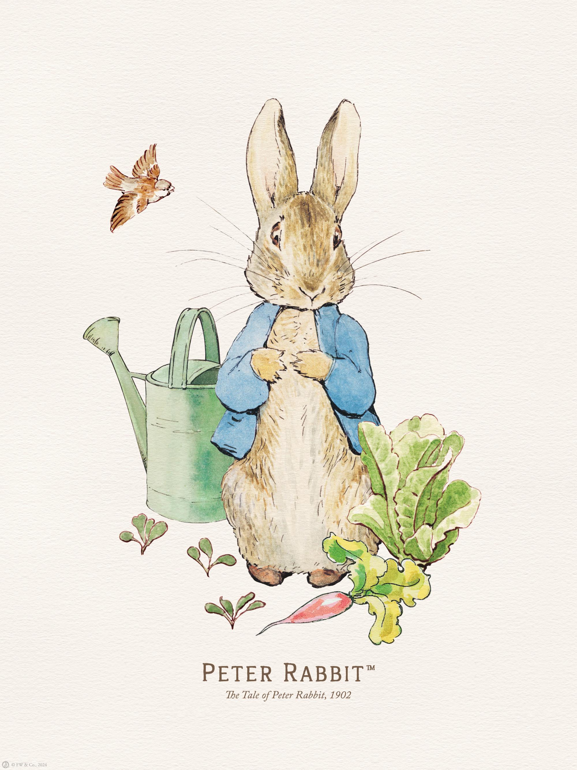 파란 재킷을 입은 피터 래빗이 초록색 물뿌리개, 잎이 무성한 채소, 빨간 무와 함께 그려진 매력적인 포스터입니다. 아이 방을 위한 완벽한 벽면 아트입니다.