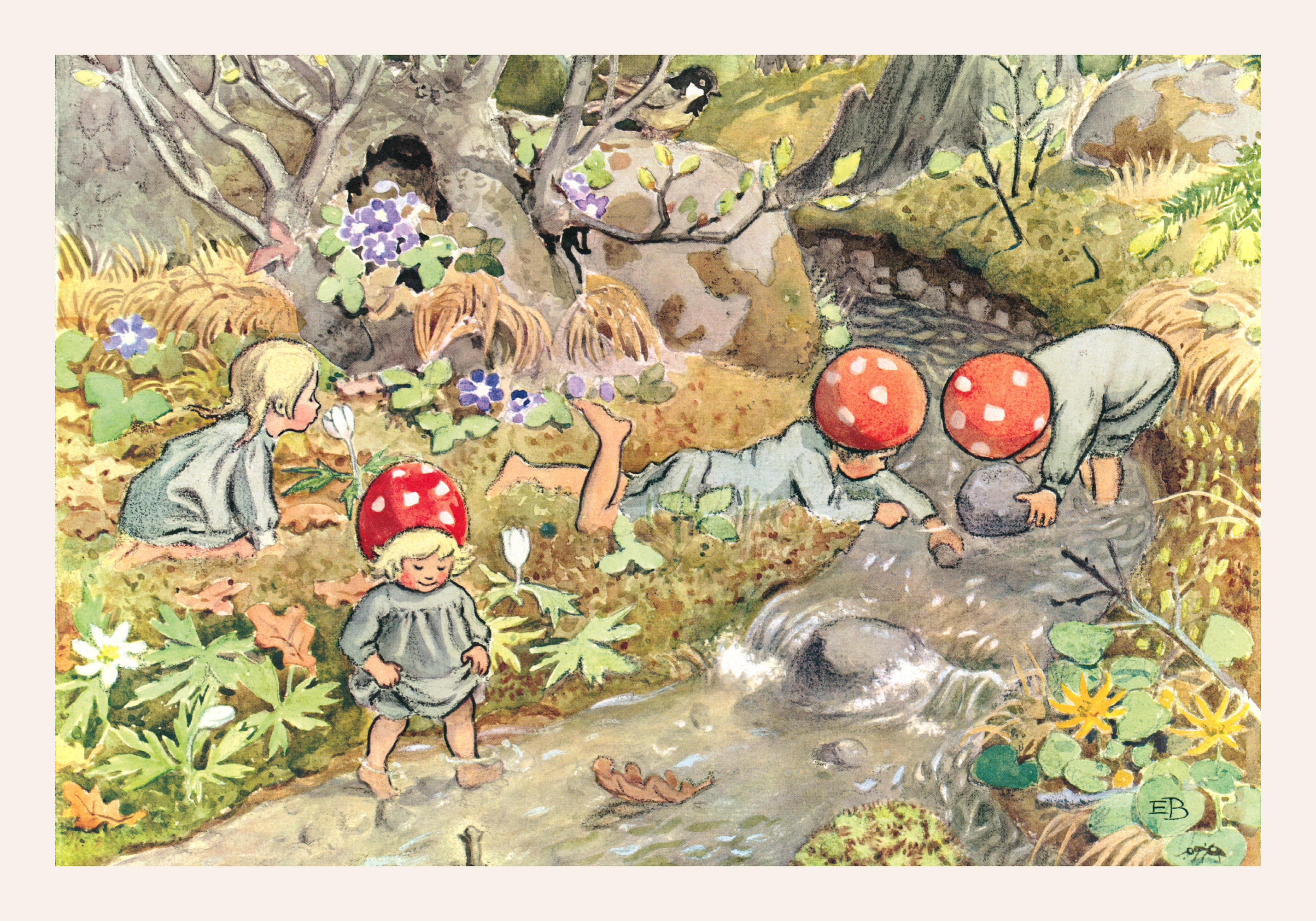 빨간 버섯 모자를 쓴 아이들이 꽃과 시냇물, 작은 새가 있는 다채로운 숲에서 노는 환상적인 포스터입니다.