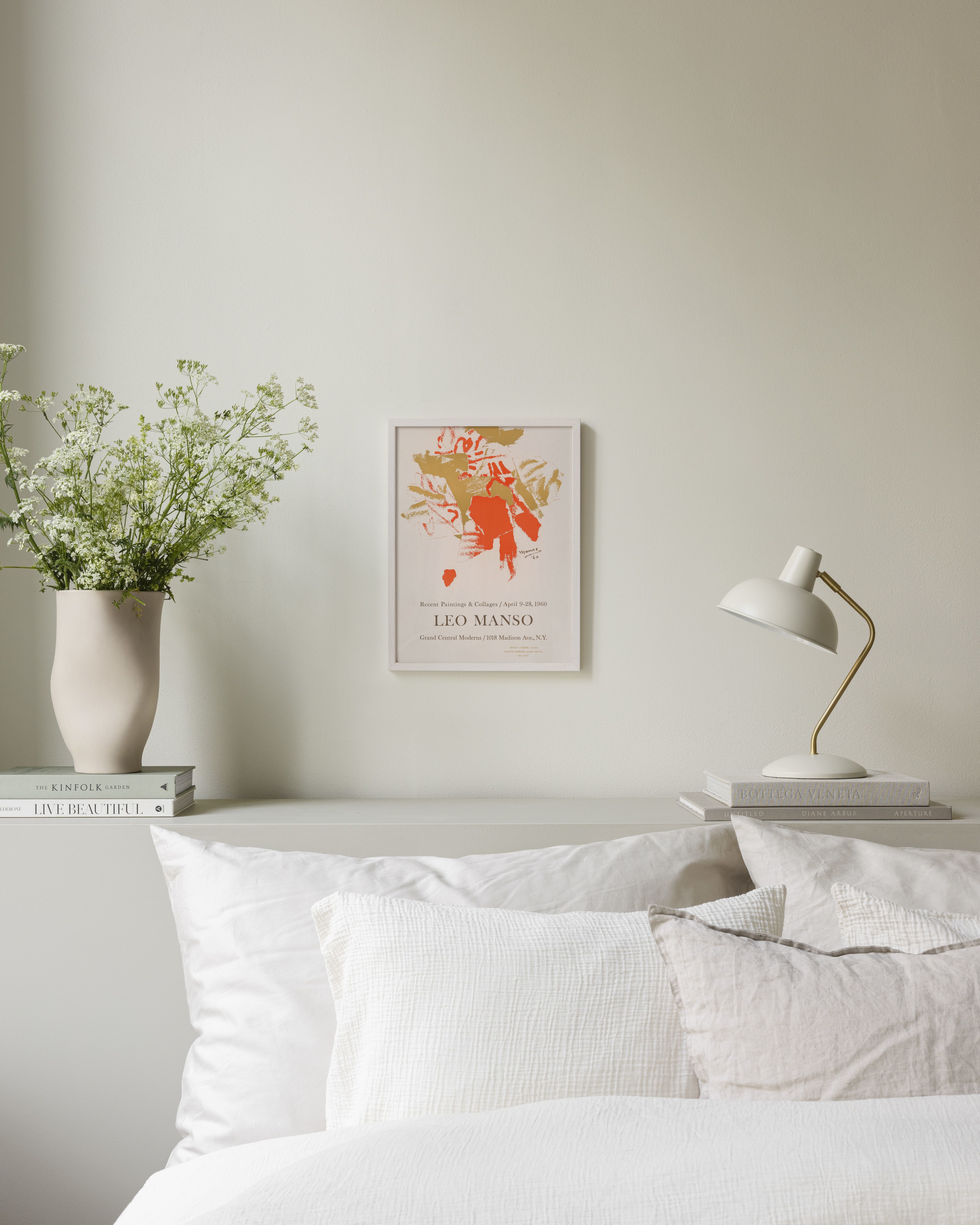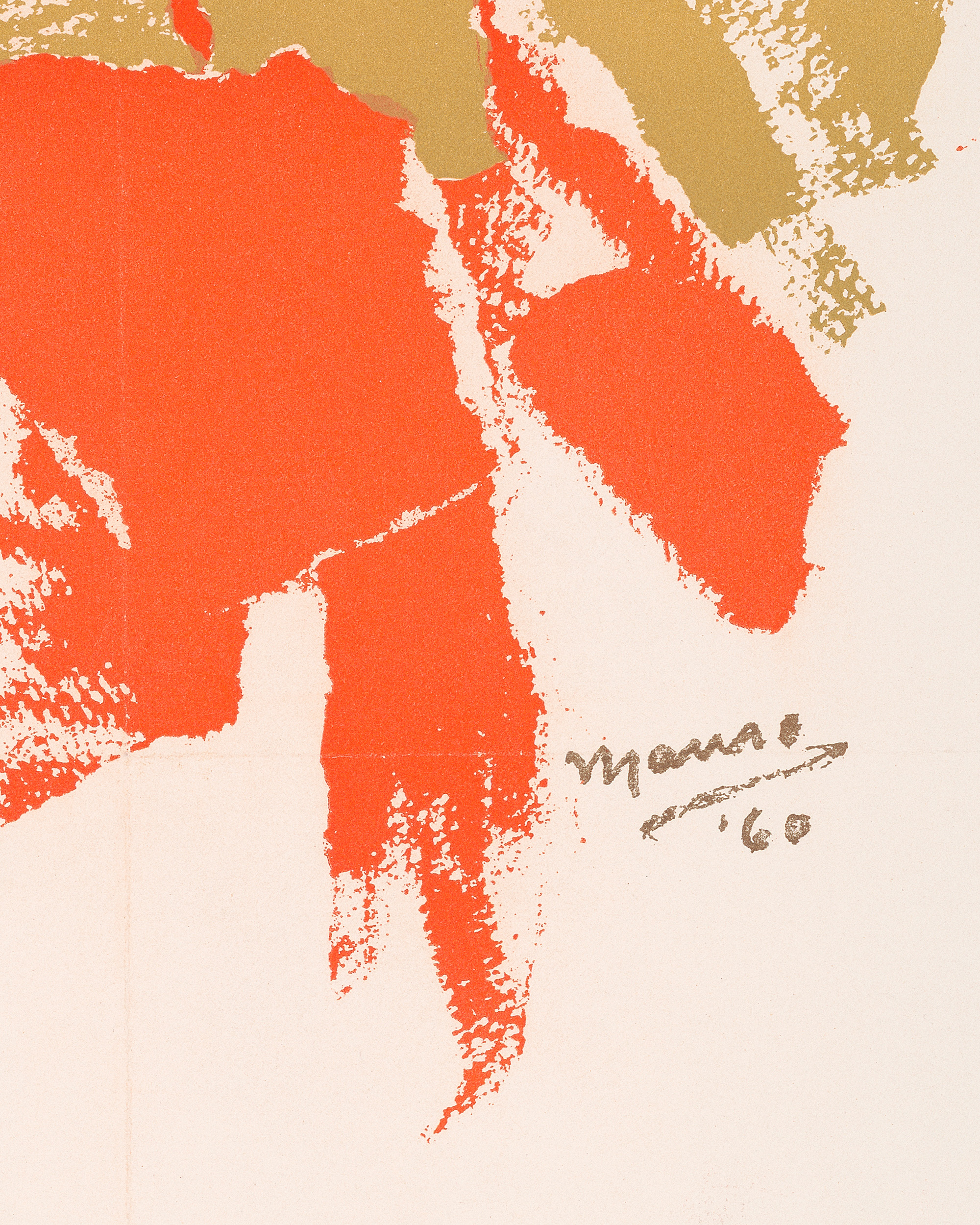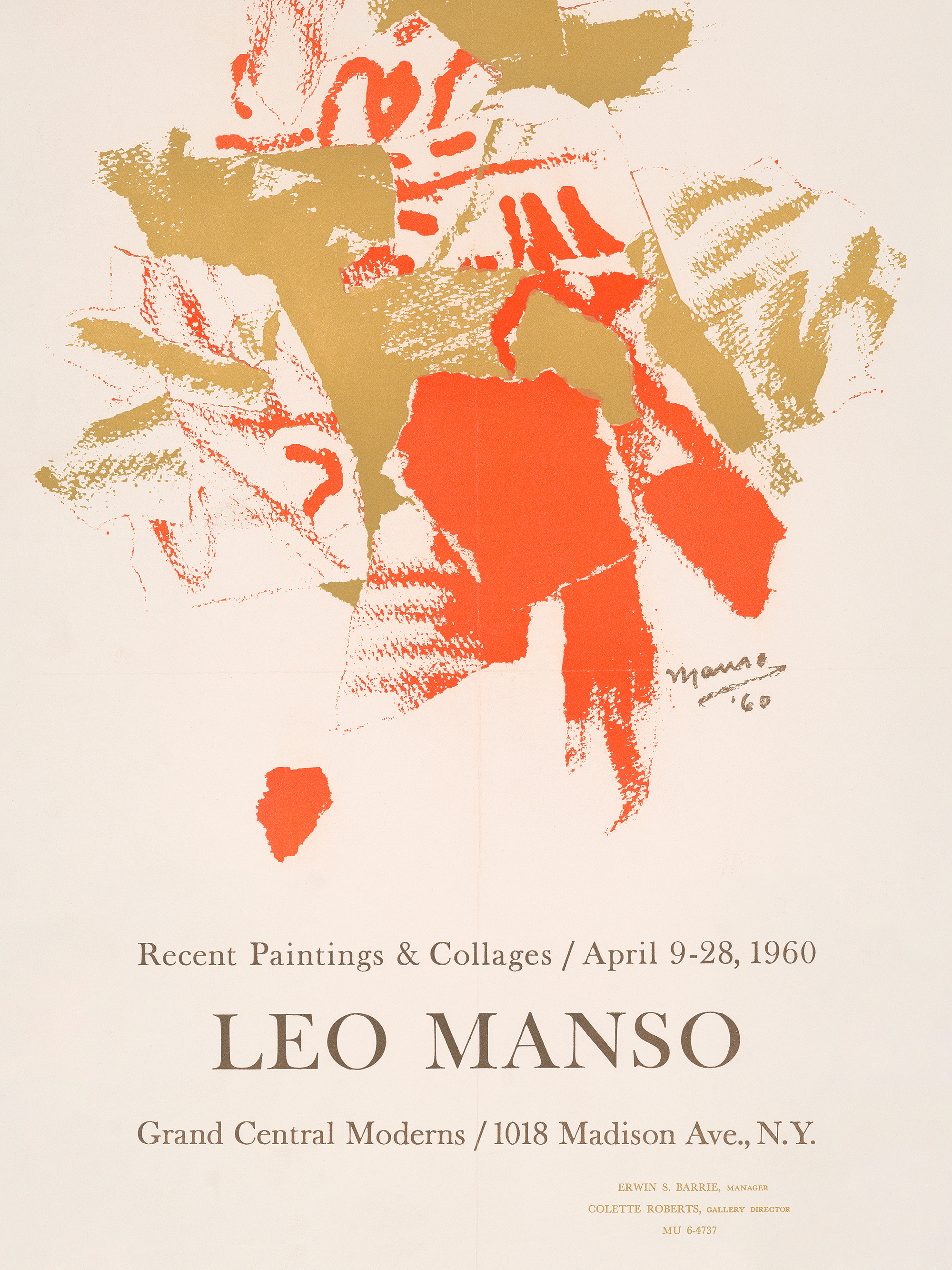 빨강, 베이지, 올리브 그린의 추상적인 형태를 담은 빈티지 스타일의 포스터입니다. 1960년 Leo Manso의 미술 전시회에 대한 텍스트를 담아 레트로 갤러리 느낌을 줍니다.