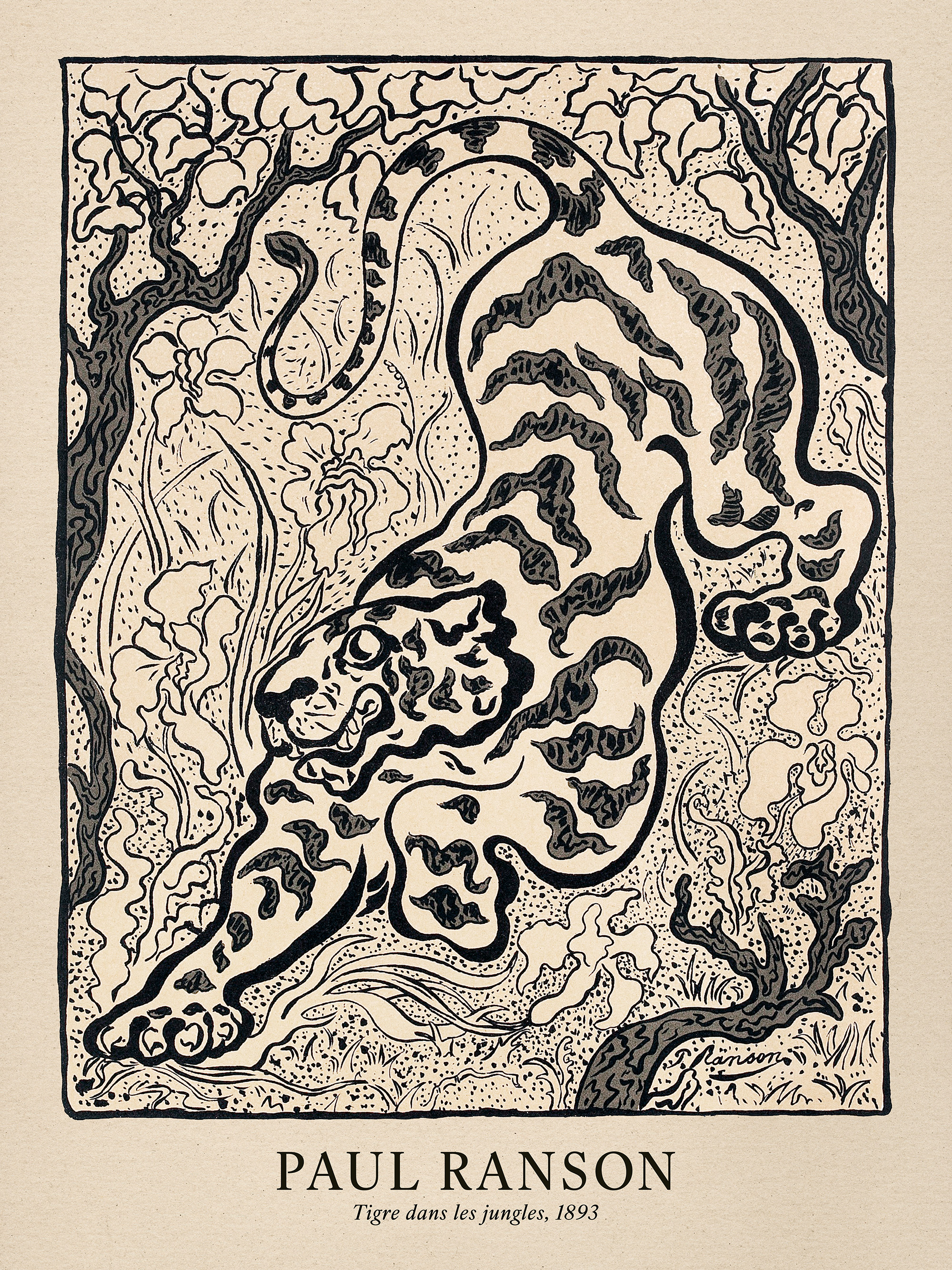 From ₩28,778.40정글 배경에서 굵은 줄무늬를 가진 호랑이의 흑백 포스터입니다. 이 빈티지 스타일의 포스터는 굵고 곡선적인 라인과 장식적인 패턴이 특징입니다.
