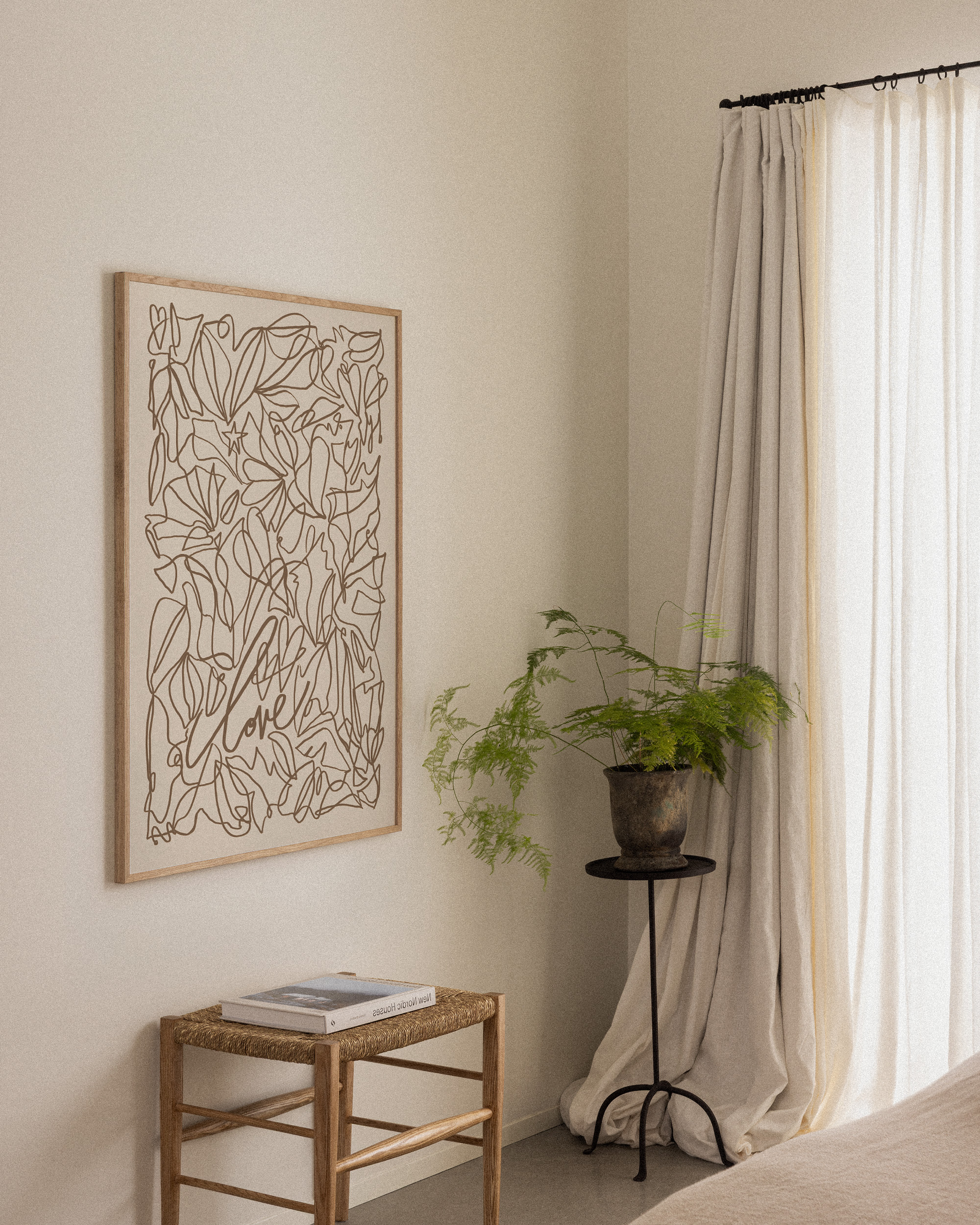밝은 베이지색 배경에 갈색으로 그려진 잎과 꽃의 추상적인 형태가 담긴 포스터입니다. 중앙에는 흐르는 듯한 연속적인 선으로 "love"라는 단어가 쓰여 있습니다.