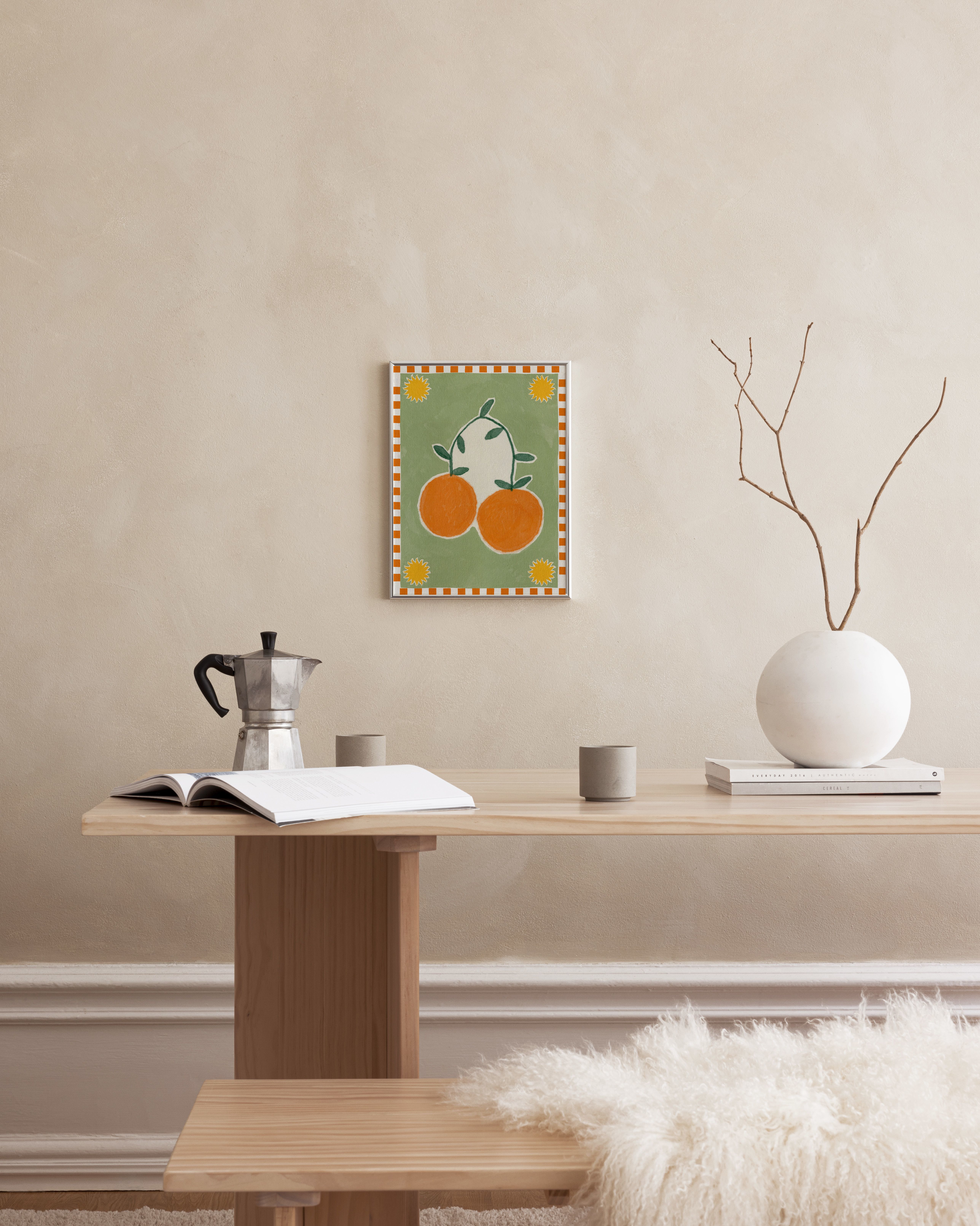 연한 초록색 배경에 초록 잎이 달린 두 개의 큰 오렌지 과일이 그려진 포스터입니다. 모서리에 노란색 태양 모양이 있는 오렌지색과 흰색 줄무늬 테두리가 있습니다.