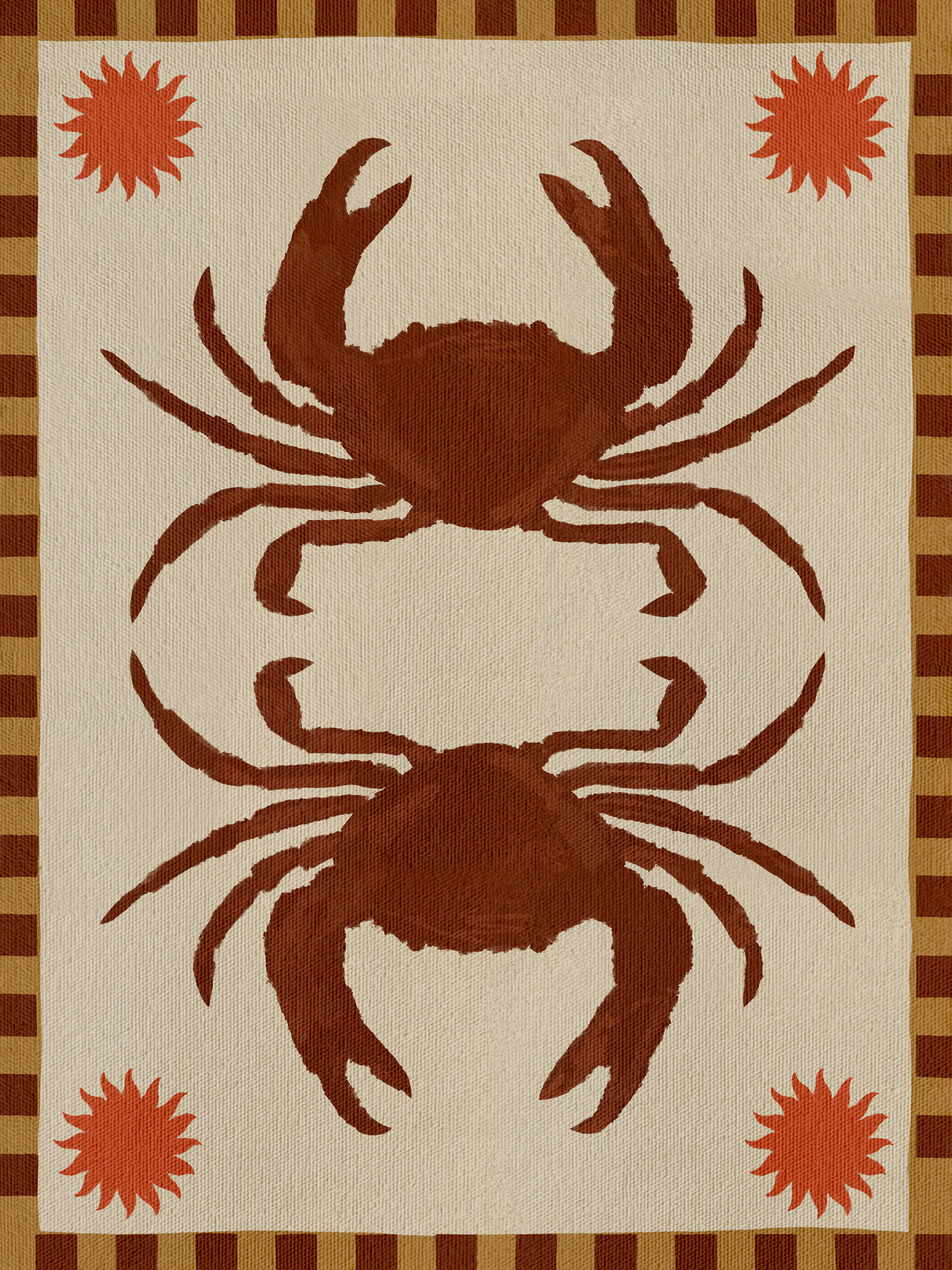 베이지색 배경에 두 마리의 갈색 게를 묘사한 포스터입니다. 모서리에는 주황색 별 모양이, 테두리에는 줄무늬가 있습니다.