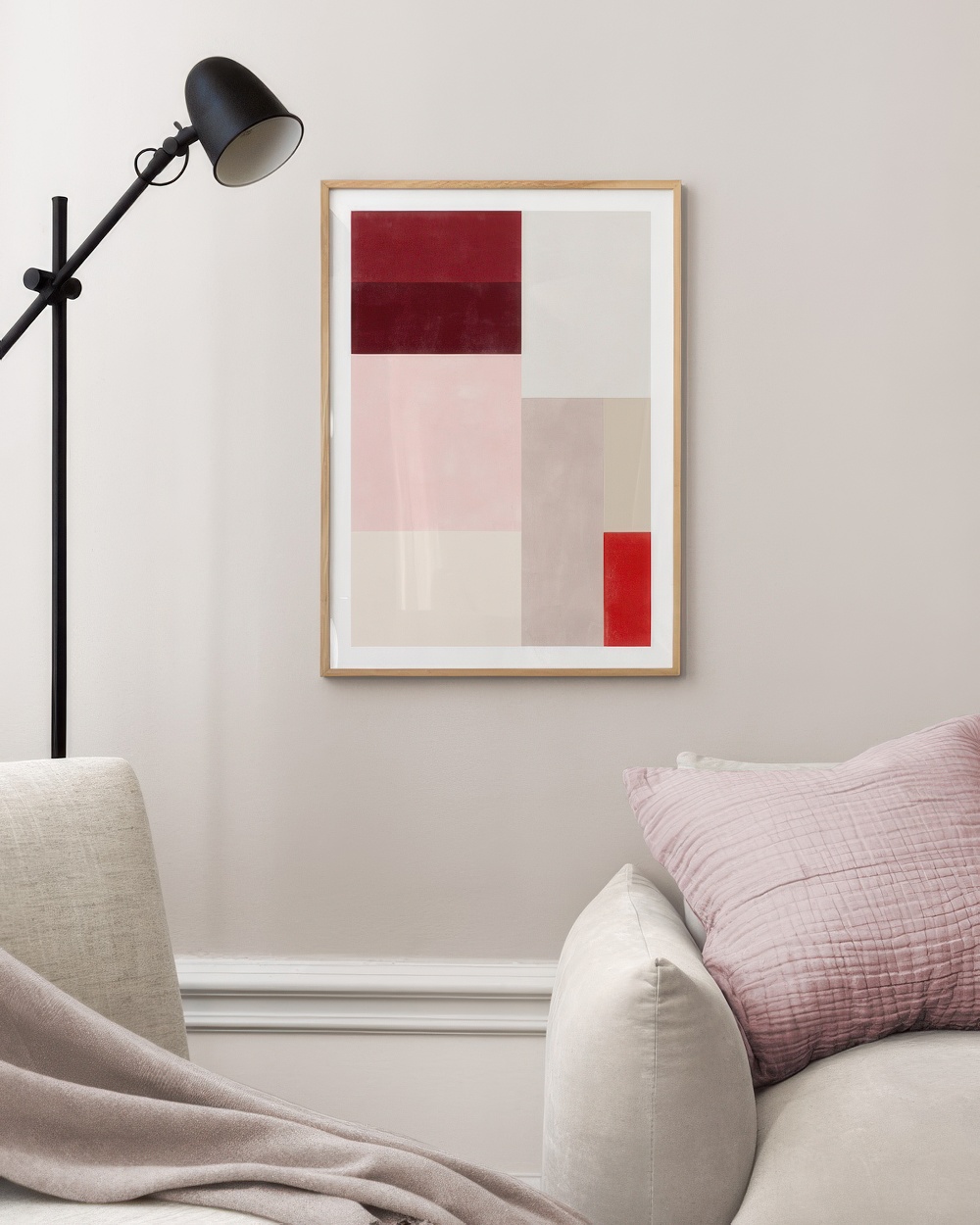 Illustration with red, pink and beige colour blocks. This geometric art print is perfect in a living room where you want to create a modern look!