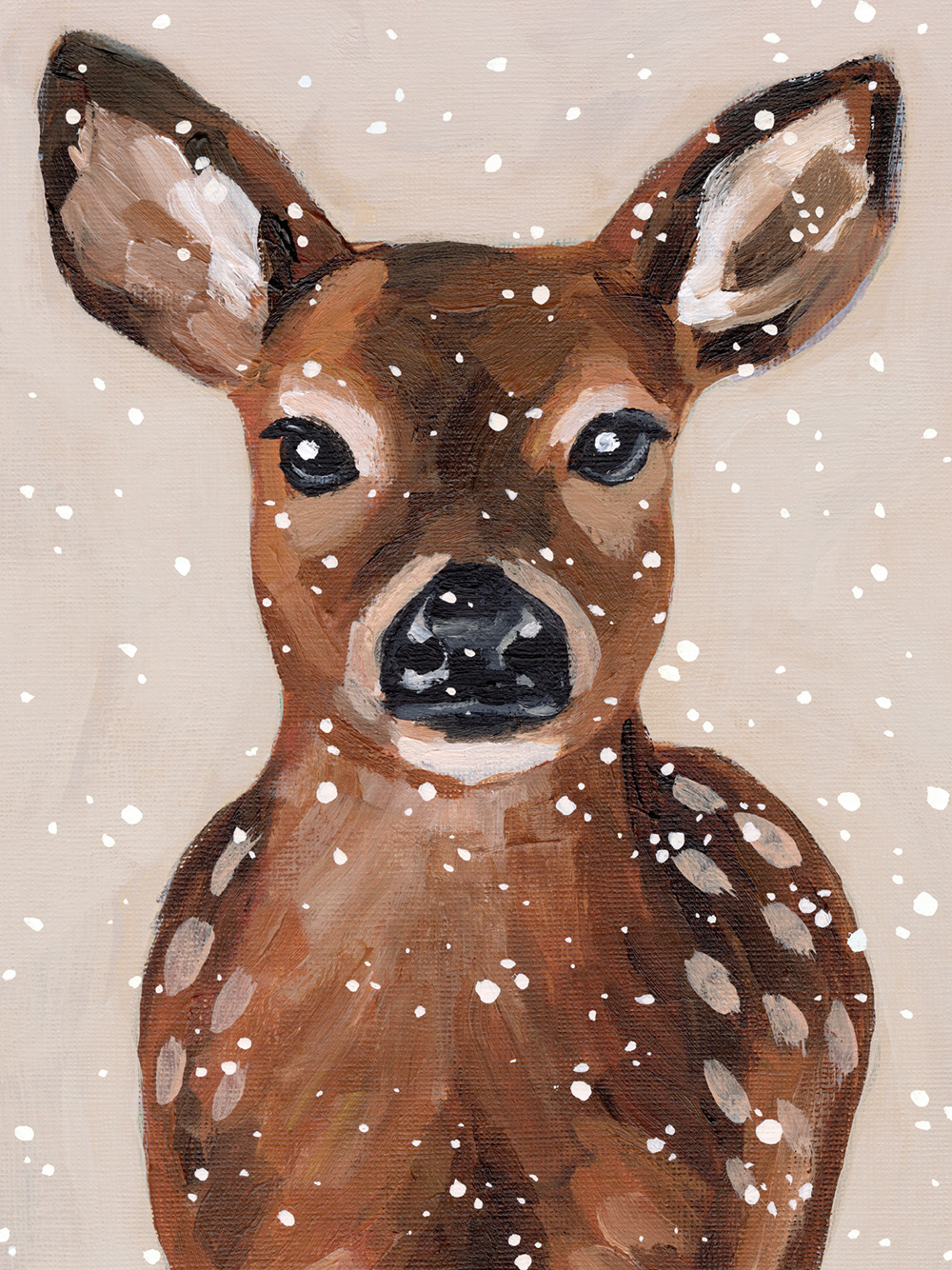 갈색 털과 하얀 반점을 가진 어린 사슴의 사랑스러운 포스터입니다. 연한 베이지색 배경 위에서 새끼 사슴 주변으로 아름다운 눈송이가 떨어지고 있습니다.