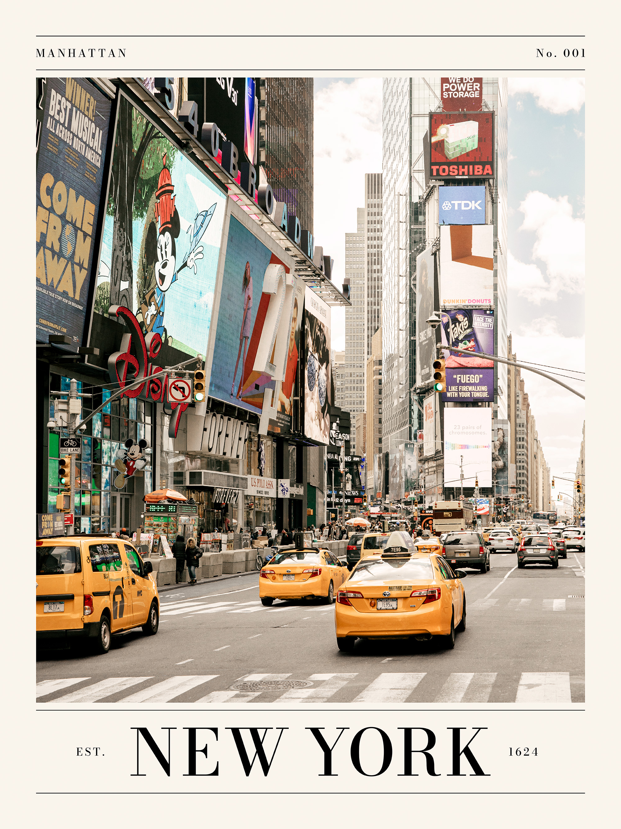 노란 택시, 높은 건물, 화려한 광고판이 있는 맨해튼의 번화한 거리를 담은 포스터입니다. 뉴욕을 사랑하는 분들을 위한 완벽한 벽 아트입니다!