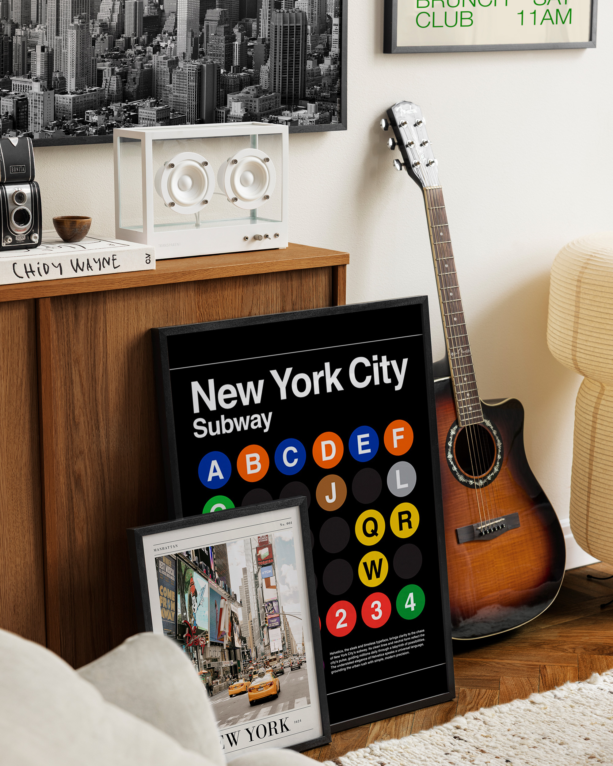 노란 택시, 높은 건물들, 그리고 화려한 광고판이 있는 맨해튼의 번화한 거리를 담은 포스터입니다. 뉴욕을 사랑하는 분들을 위한 완벽한 벽 장식입니다!