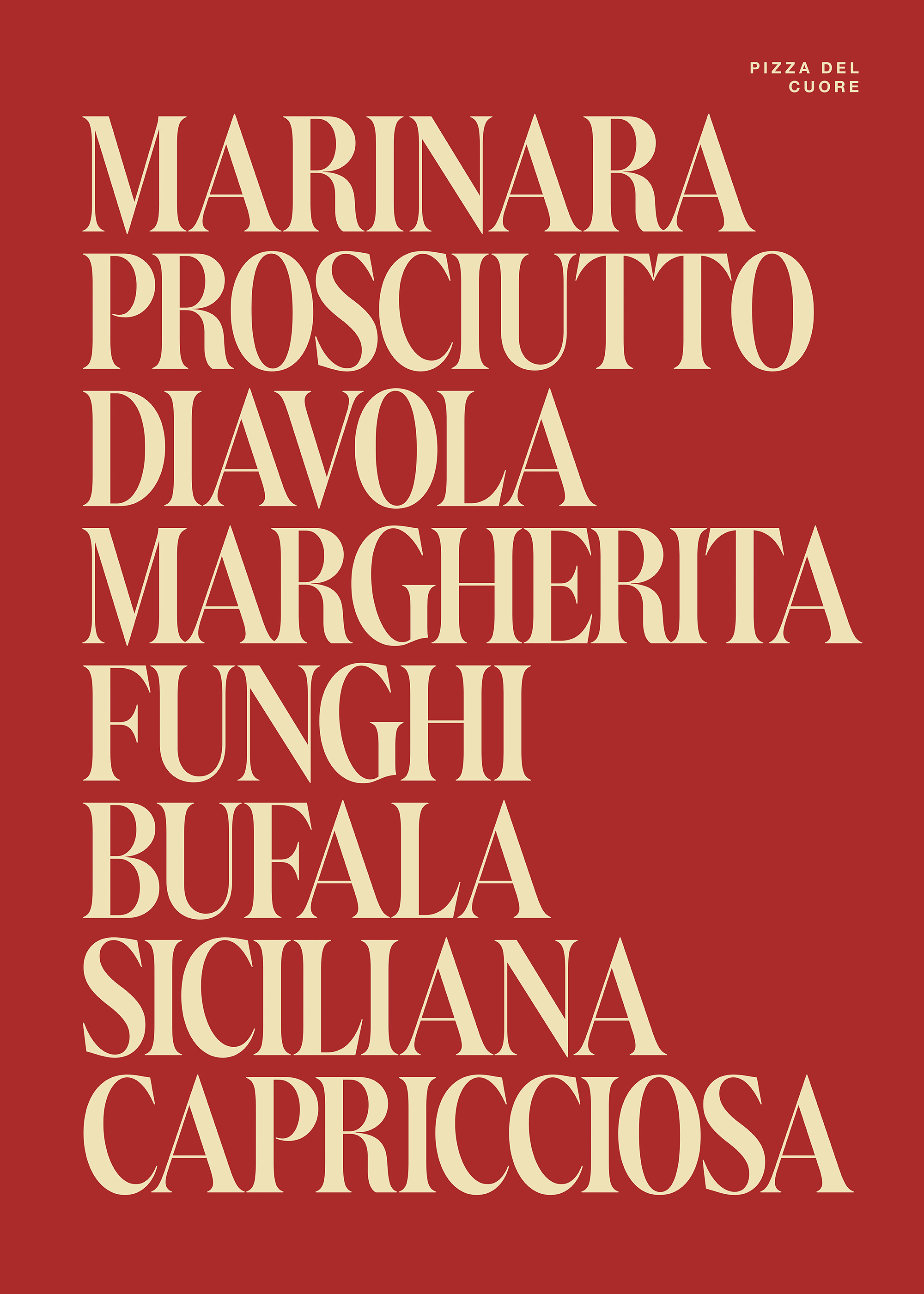 피자, 파스타, 와인이 있는 테이블과 Margherita, Funghi, Capricciosa 등 클래식 이탈리아 피자 목록이 담긴 포스터 팩.