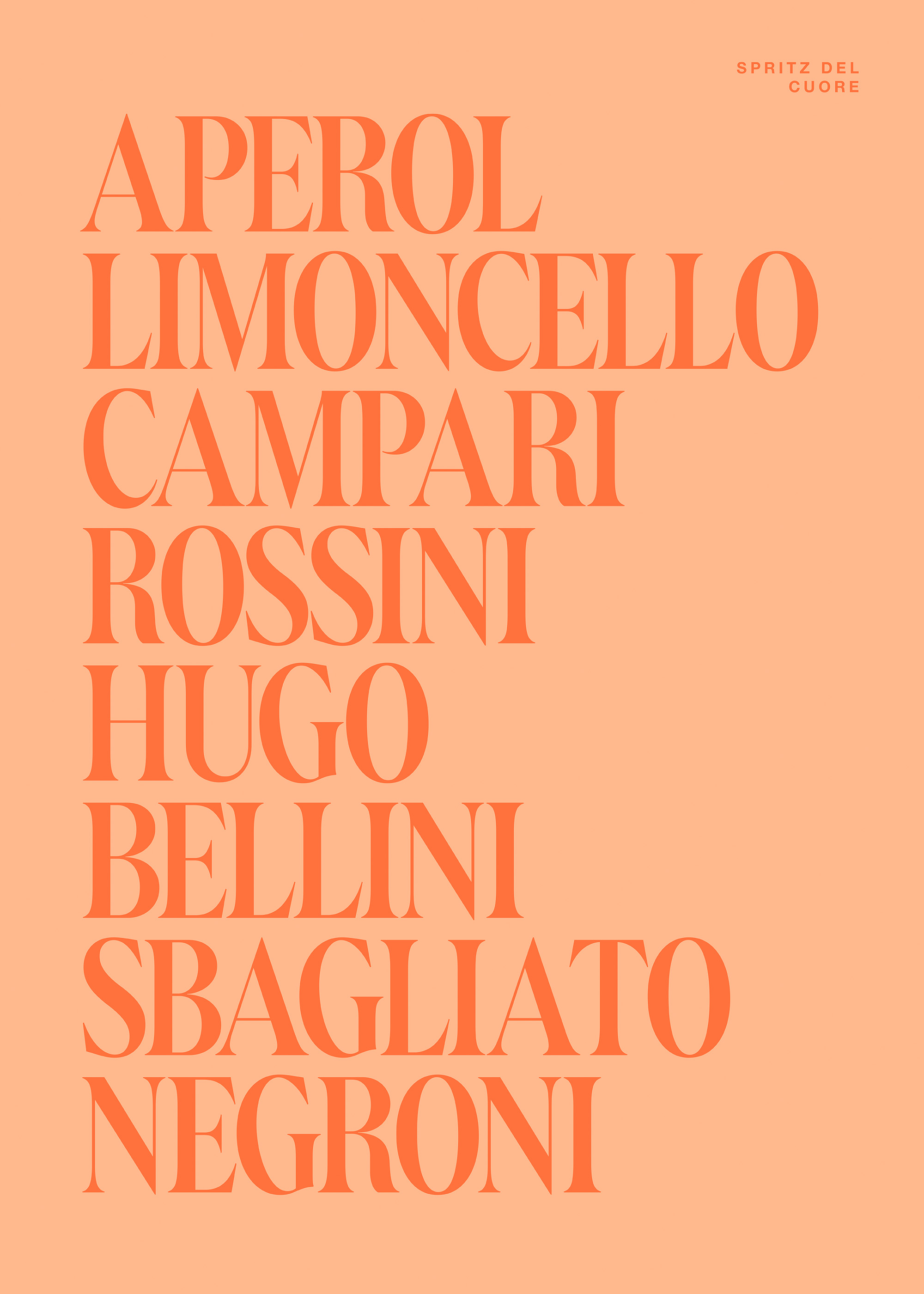 이탈리아 식전주 Aperol Spritz를 담은 두 개의 포스터로 구성된 포스터 팩입니다. 한 포스터는 아페롤 한 병과 글라스, 오렌지, 그리고 녹색 잎을 보여줍니다. 다른 포스터는 복숭아색 배경에 오렌지색 텍스트로 클래식한 이탈리아 음료들을 나열합니다.