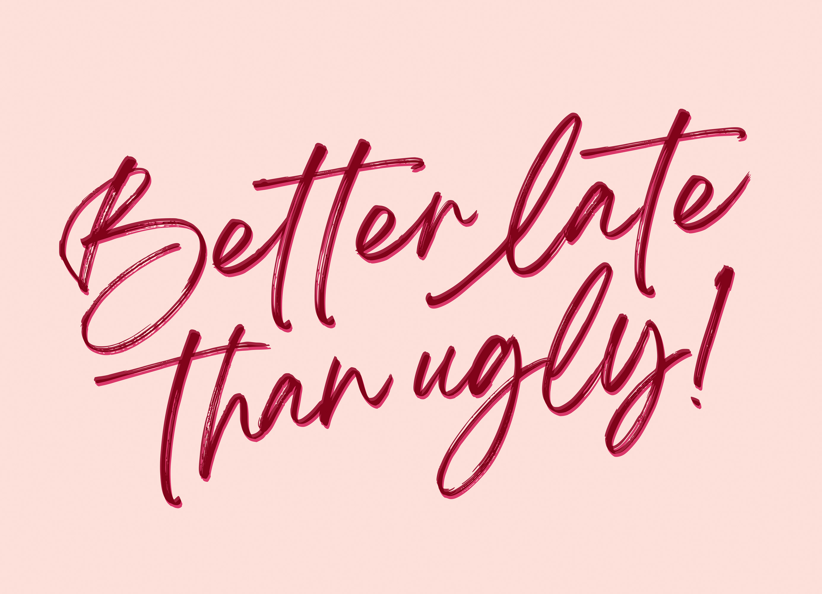 연한 핑크색 배경에 'Better late than ugly!'라는 손글씨 문구가 진한 핑크색으로 적혀 있는 재미있는 포스터입니다. 집에 유쾌한 분위기를 더해주는 완벽한 벽 장식입니다.