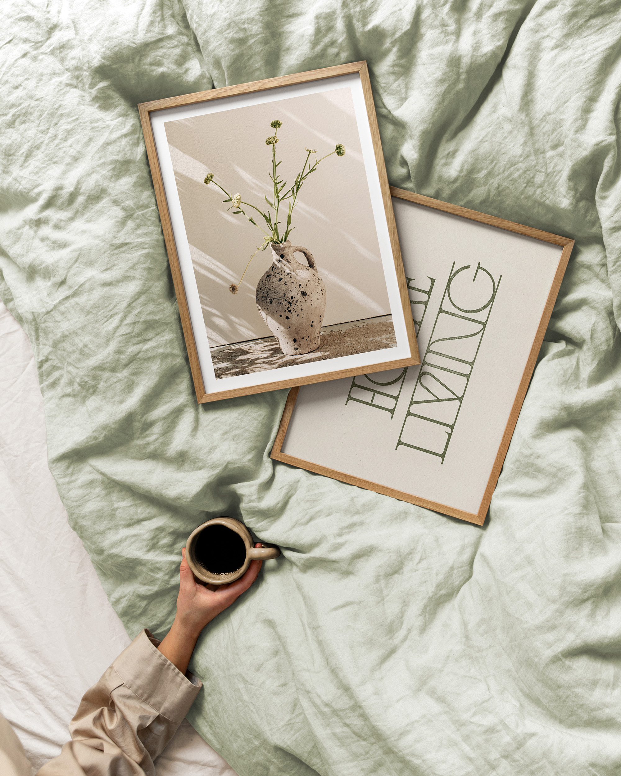 베이지 배경에 우아한 녹색 글자로 "Home Living"이라는 텍스트가 적힌 포스터입니다. 거실을 위한 완벽한 벽면 아트입니다.