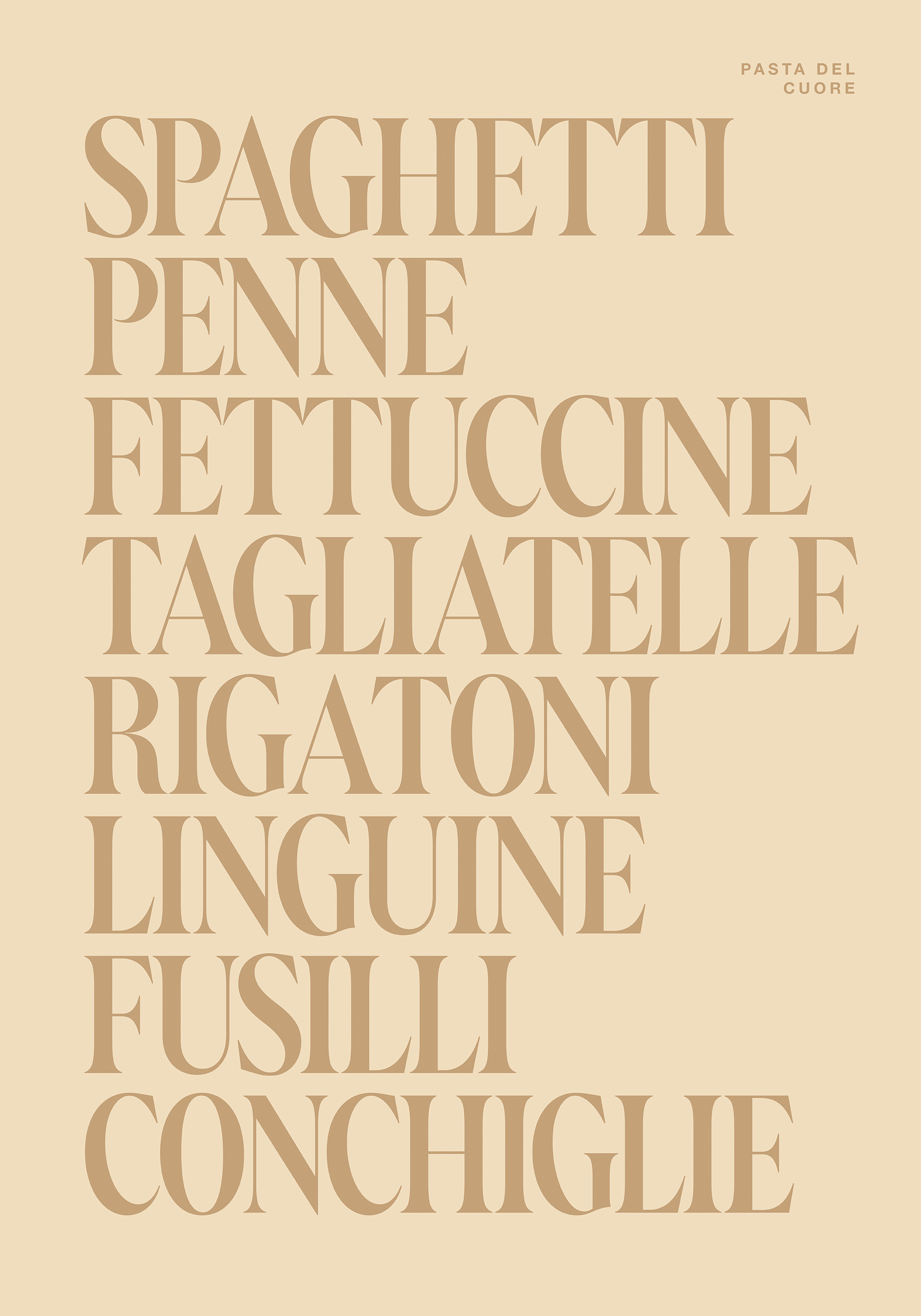 베이지 배경에 브라운 텍스트로 다양한 종류의 파스타가 담긴 포스터입니다. 주방을 위한 완벽한 벽 장식입니다!