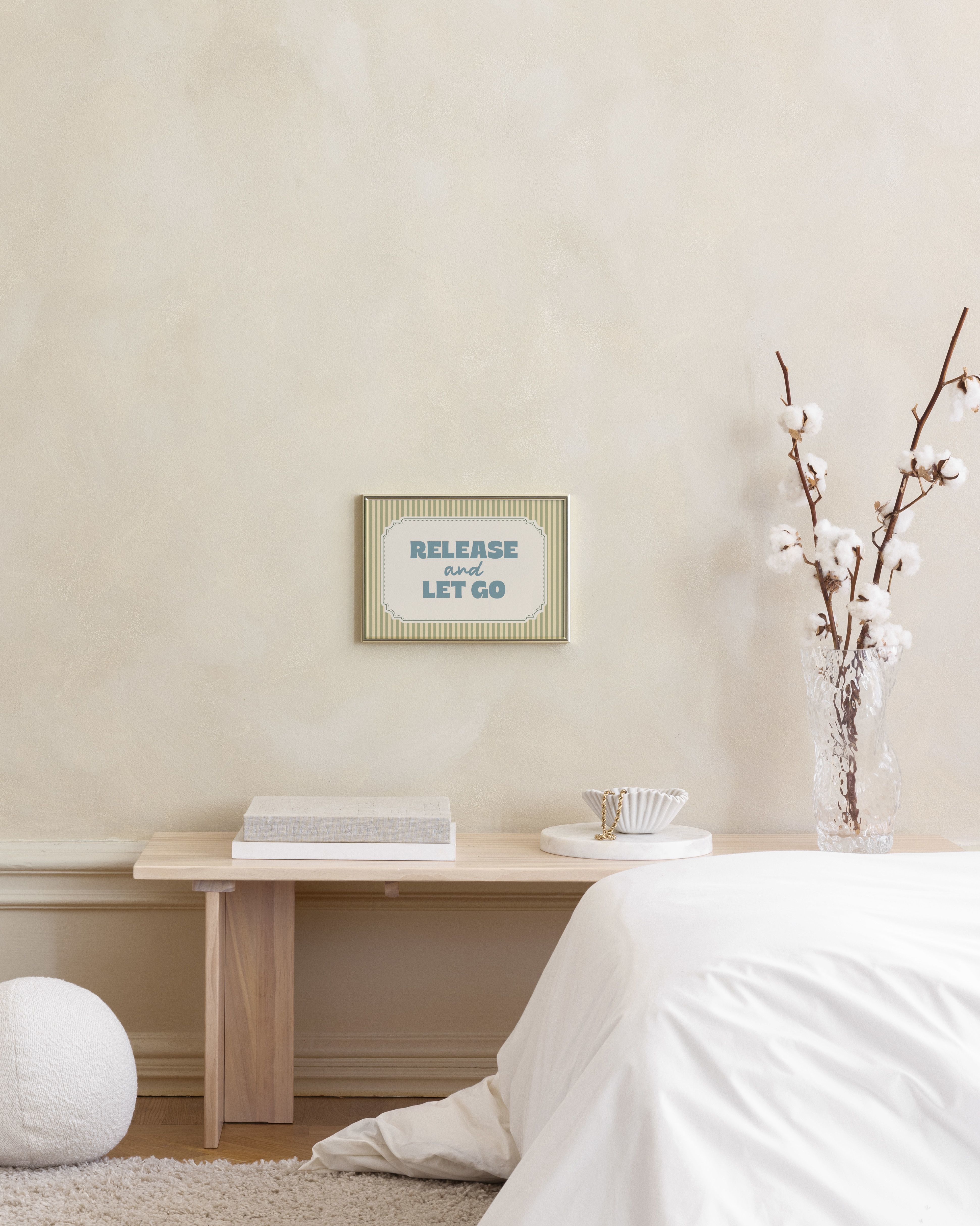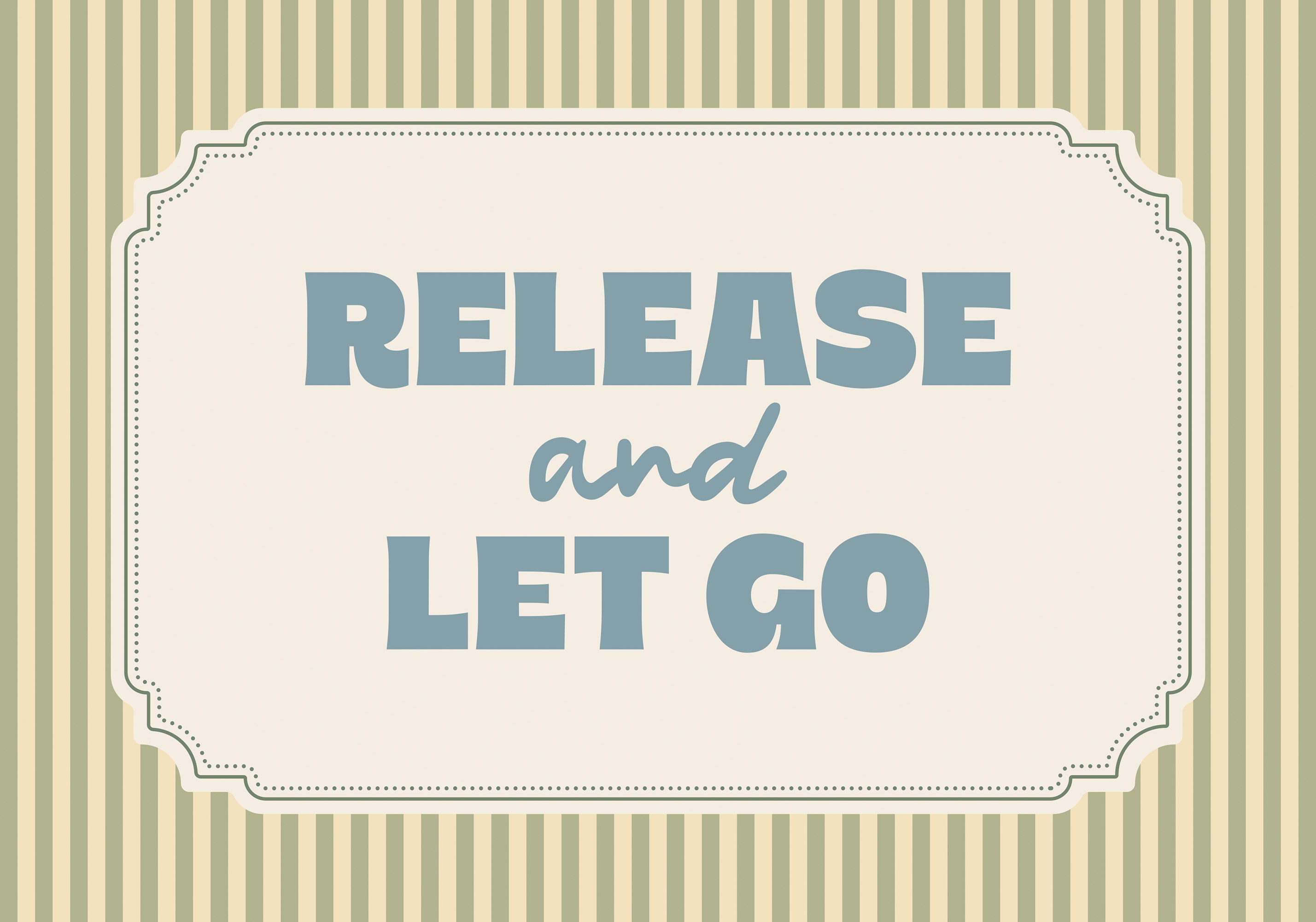 그린과 베이지 스트라이프가 있는 베이지색 배경에 "Release and Let Go"라는 문구가 청회색 글자로 적힌 동기부여 포스터입니다.