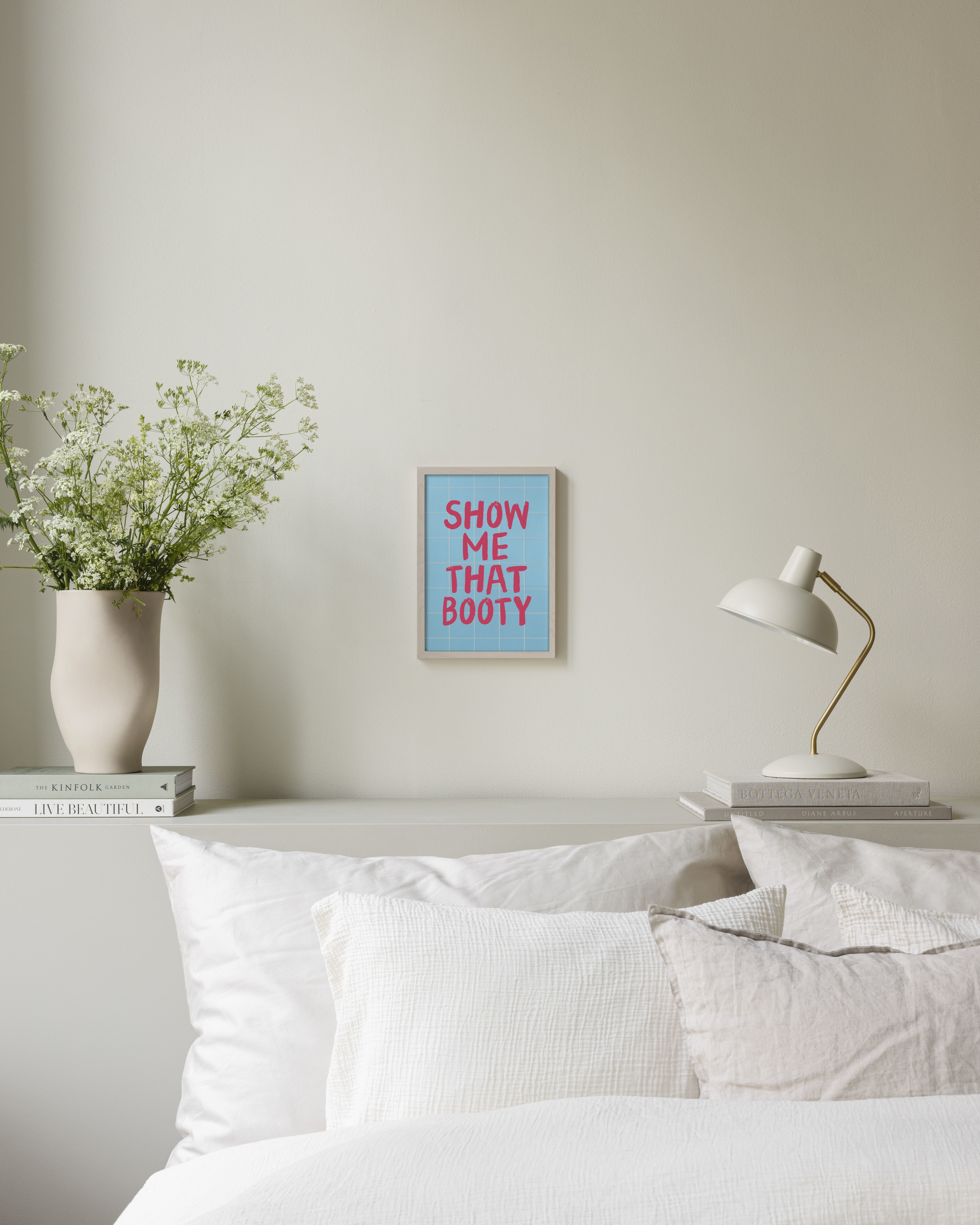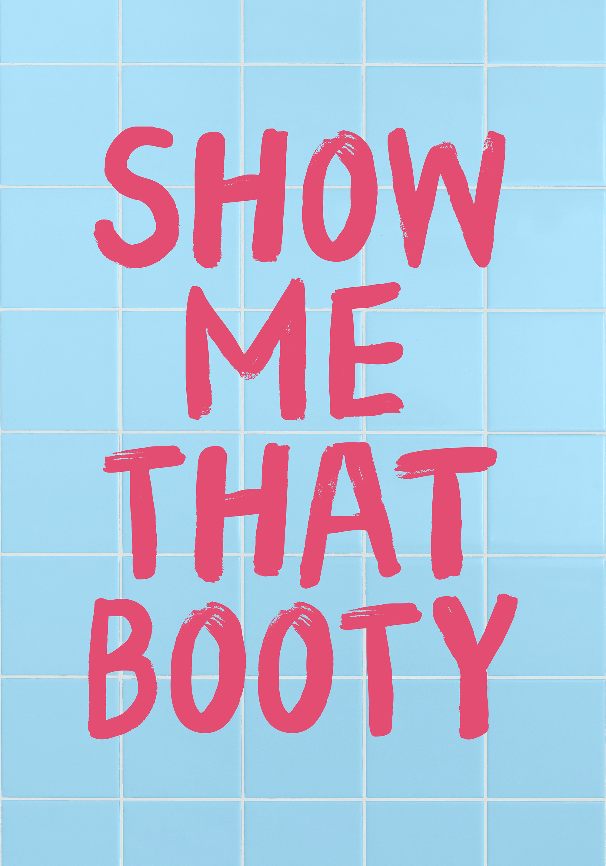 파란색 타일 배경에 "SHOW ME THAT BOOTY"라는 굵은 핑크색 글씨가 담긴 재미있는 포스터입니다. 집에 유쾌한 분위기를 더해주는 완벽한 벽 장식입니다.