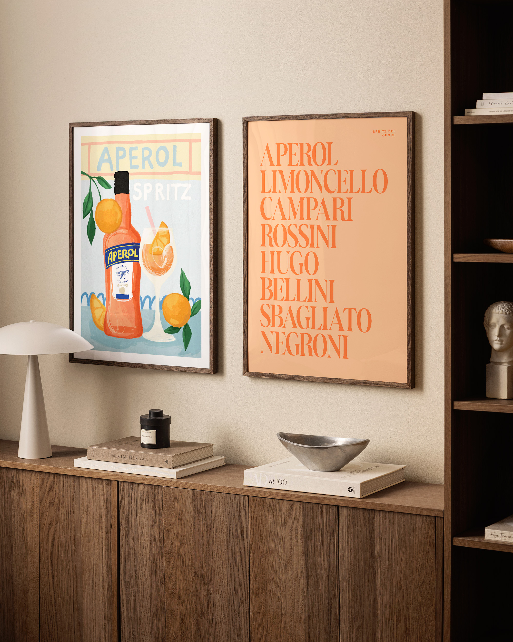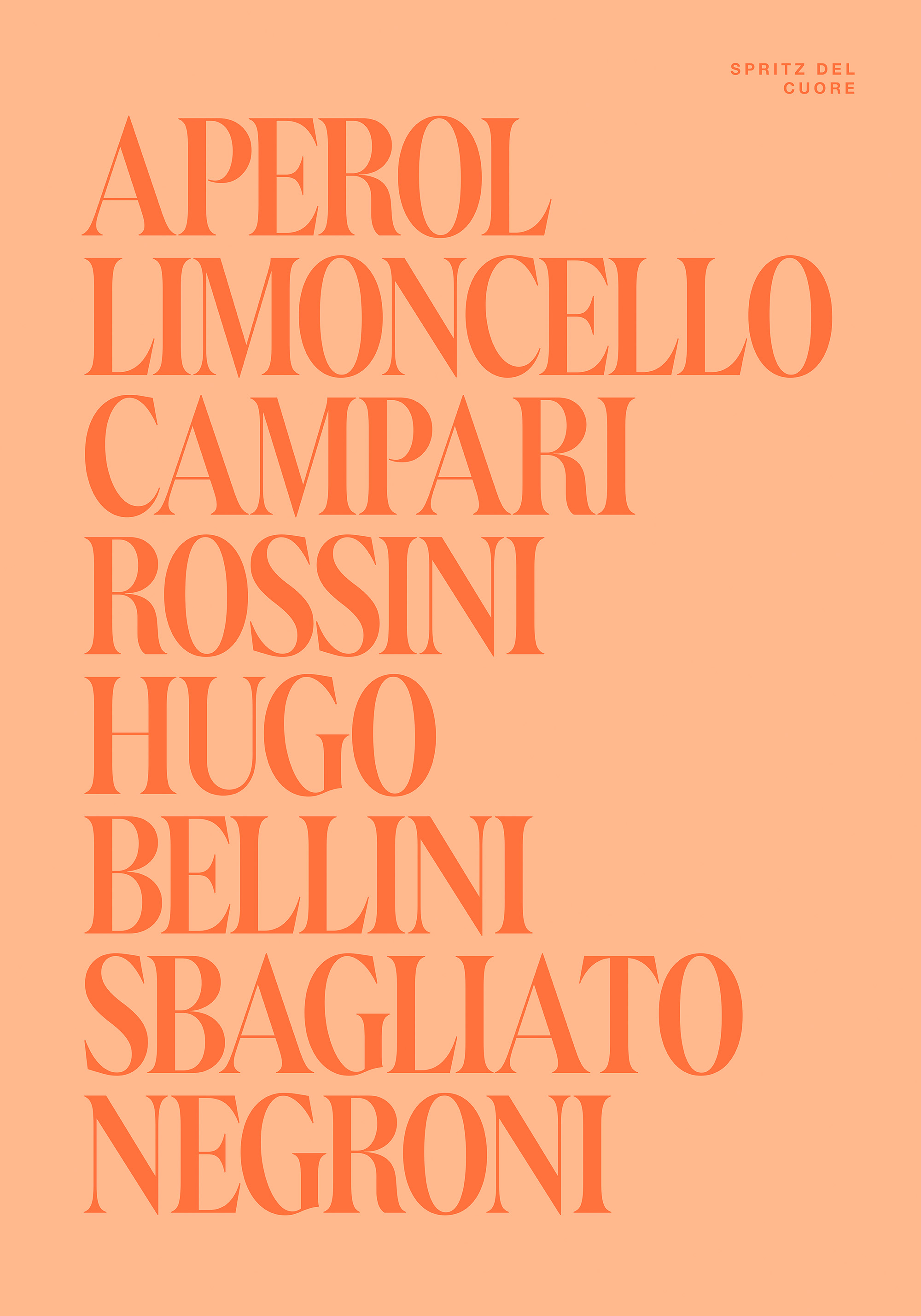 주황색 배경에 굵은 빨강-주황색 글씨로 이탈리아 아페리티프 이름들을 담은 포스터입니다. 음료 애호가를 위한 완벽한 벽 장식입니다!