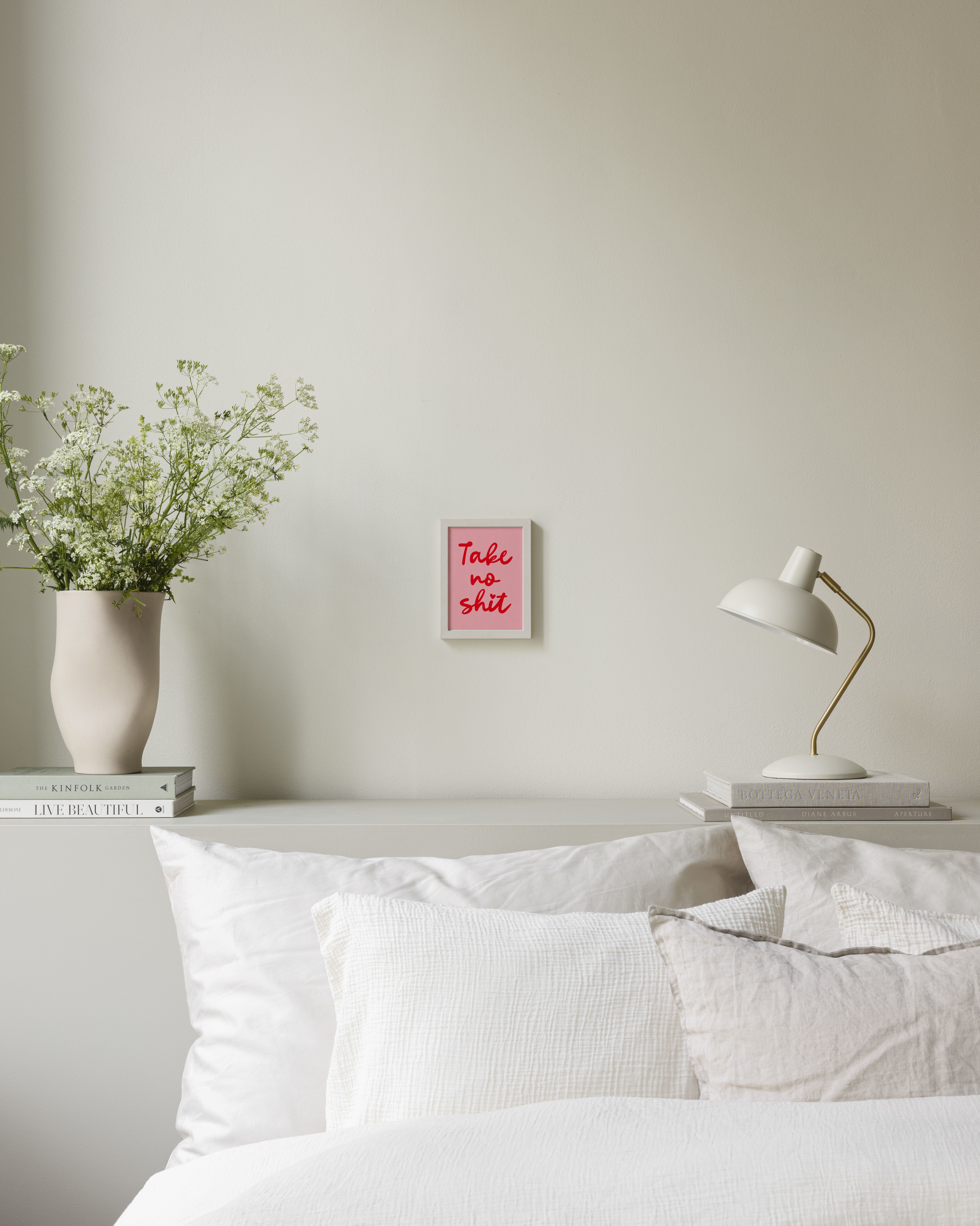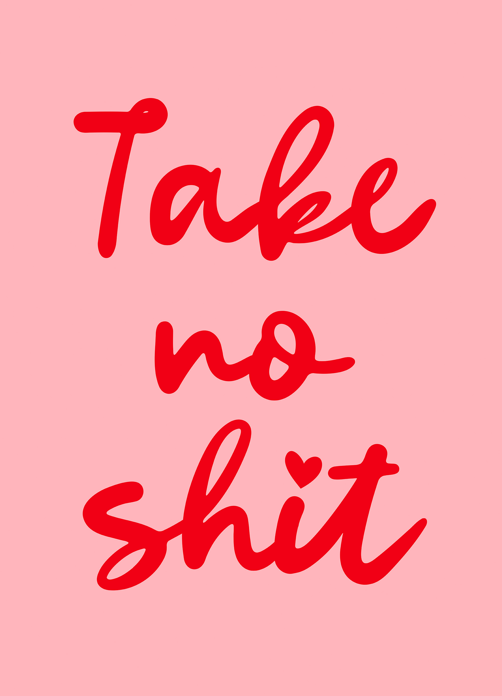 분홍색 배경에 빨간색 필기체로 "Take no shit"라고 적힌 포스터입니다. 집에 대담한 메시지를 더하고 싶은 분들을 위한 완벽한 벽 장식입니다.